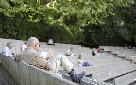 Jardim Gulbenkian, pessoas a ler, anfiteatro, leitor, reformados, leitura. Lisboa.