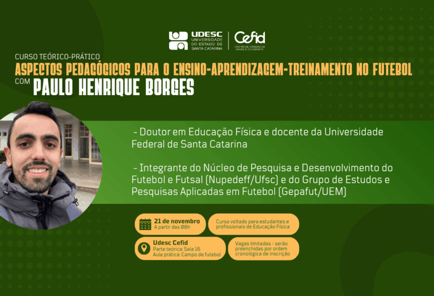 Com uma abordagem teórico-prática, o curso acontecerá em 21 de novembro, das 8h às 12h, em Florianópolis. A parte teórica será ministrada na Sala 16 da Udesc Cefid, e a prática, no próprio campo de futebol da unidade, no Bairro Coqueiros. As vagas são limitadas, então a agilidade na inscrição é essencial para garantir um lugar.